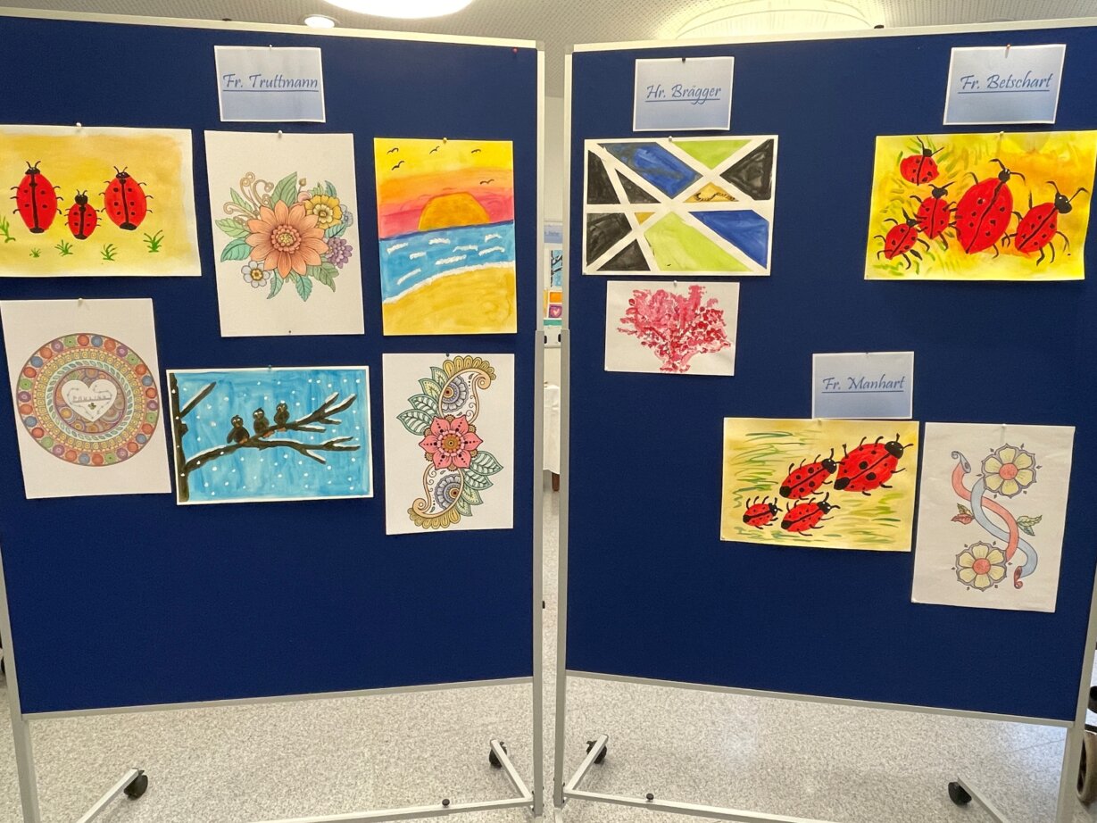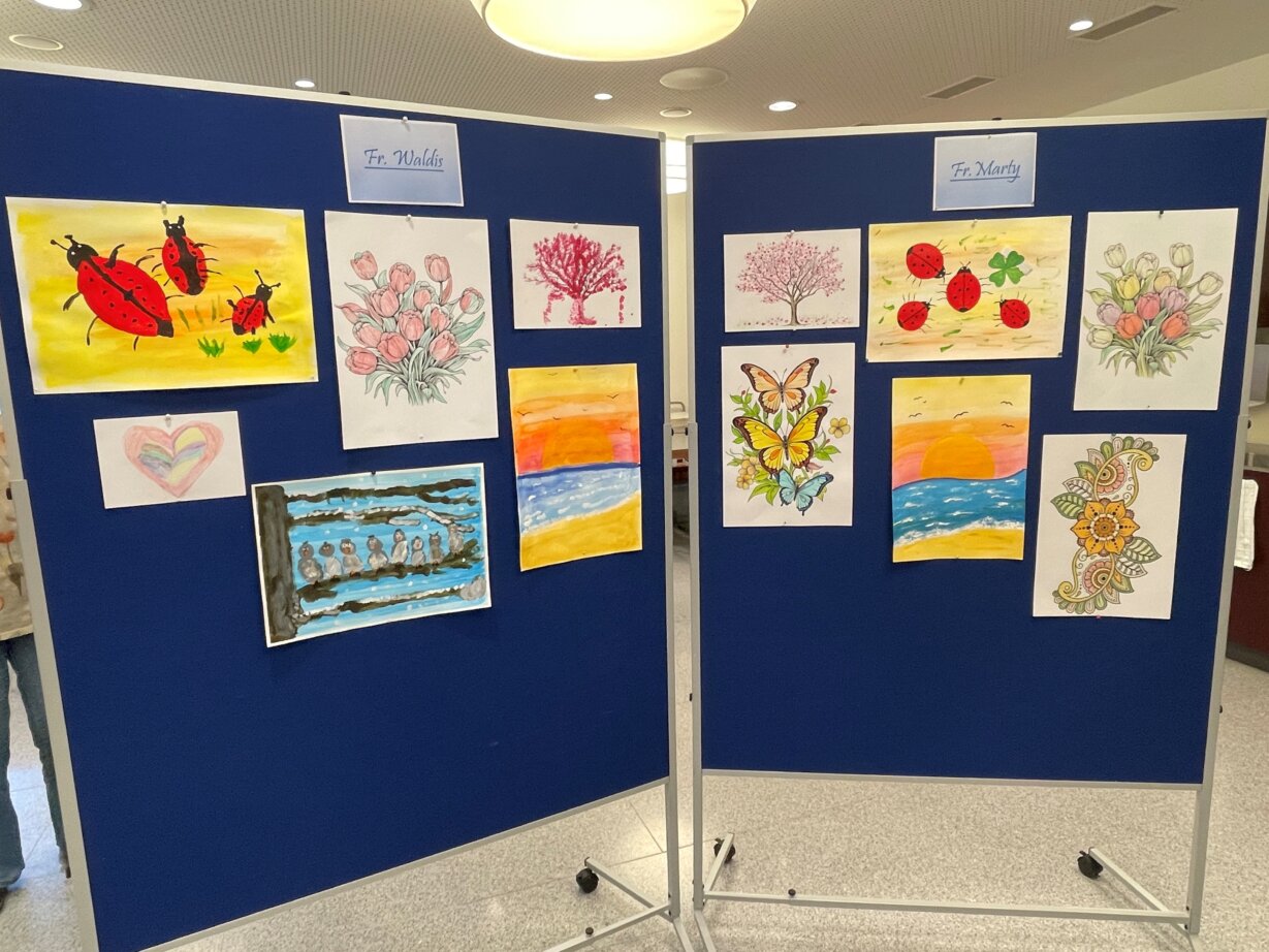 Sie stellte die ausgestellten Kunstwerke vor und erklärte die verschiedenen angewandten Techniken. Es wurde ganz traditionell mit Farbstiften gearbeitet, aber auch mit Filzstiften, was klare und kräftige Linien ermöglichte. Besonders herausfordernd war das Ausmalen eines Mandalas mit Wasserfarben, was viel Fingerspitzengefühl erforderte. Eine ganz besondere Technik kam ebenfalls zum Einsatz. Das Tupfen mit Wattestäbchen, mit dem faszinierende Strukturen und Effekte erzielt wurden. Schön war zu sehen, wie individuell und einzigartig jedes Werk gestaltet war, Ausdruck der Persönlichkeit und Kreativität jedes einzelnen Künstlers.