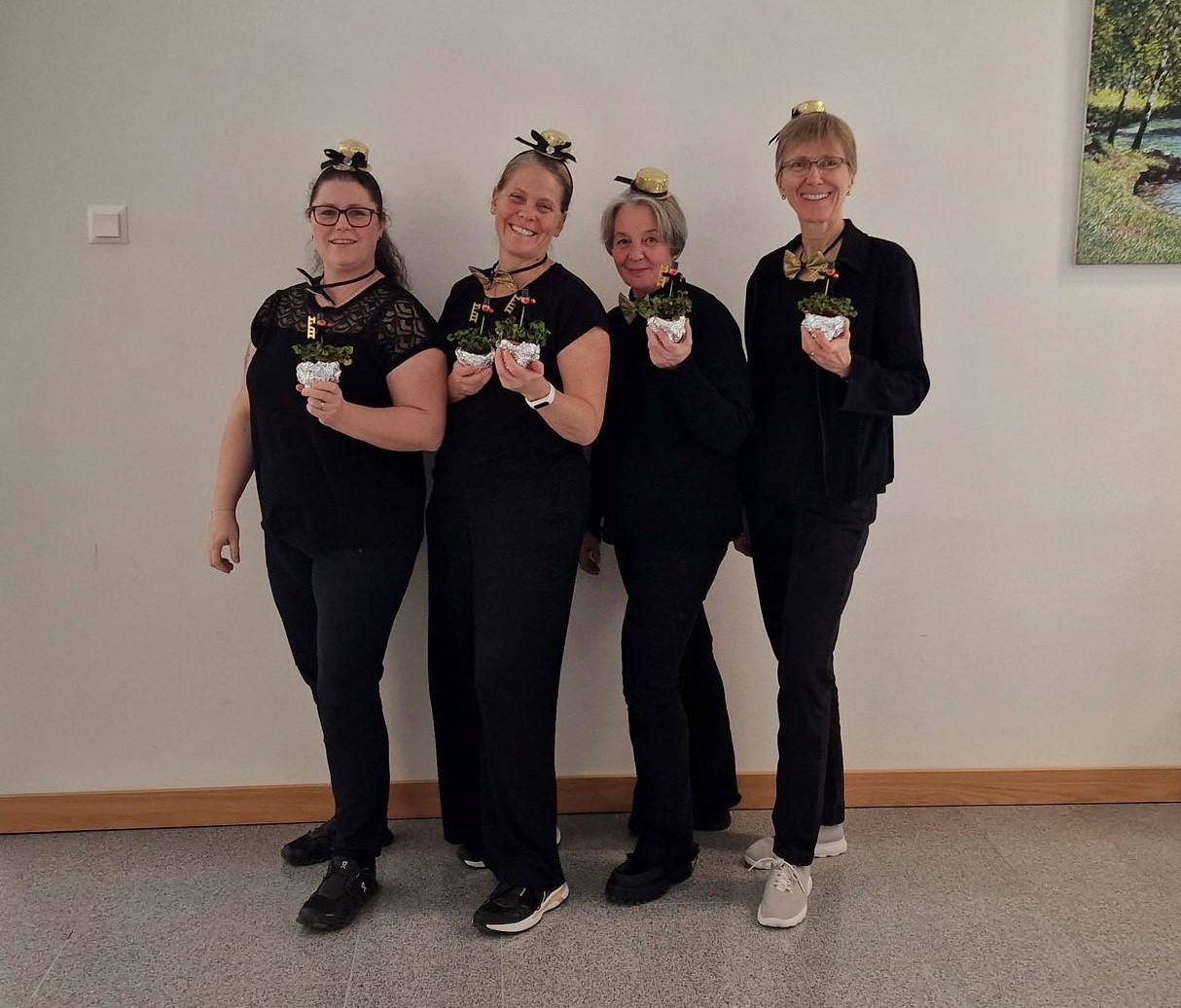 An Silvester war es wieder so weit. Mit viel Herz und guter Laune waren die Glücksboten in beiden Häusern unterwegs. Sie waren gut zu erkennen, schwarz gekleidet, mit goldenem Zylinder und goldener Fliege und mit viel Glücksklee im Gepäck, die sie mit grosser Freude verteilten. Mit dieser kleinen Geste schenkten sie Nähe, Aufmerksamkeit und ein Lächeln. Sie nahmen sich Zeit für jeden einzelnen Bewohnenden, überbrachten eine Glückskleepflanze und wünschten von Herzen ein glückliches, gesundes neues Jahr.